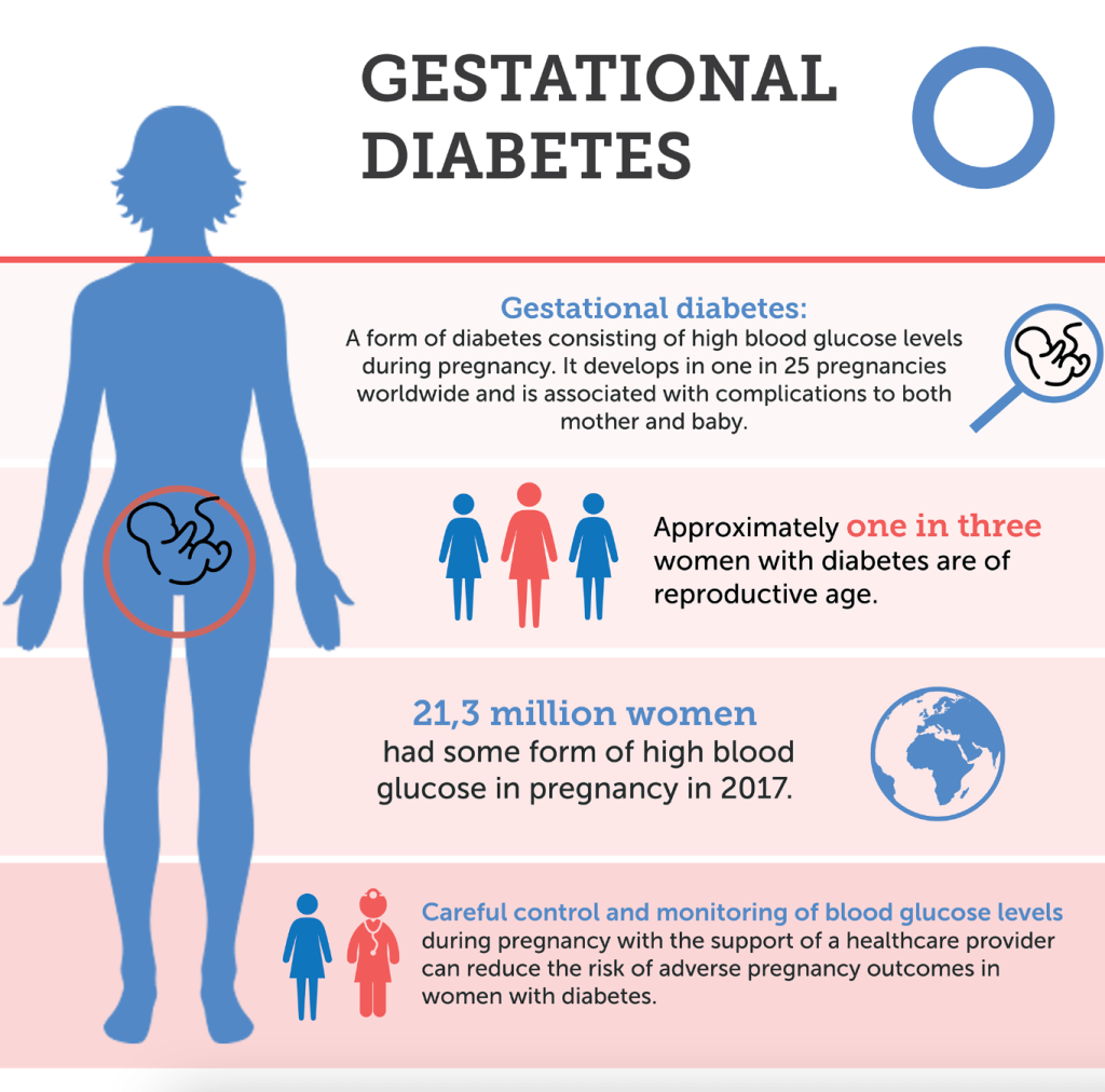 Gestational diabetes is a form of diabetes that occurs during pregnancy. It usually develops around the 24th week of pregnancy when the body is unable to produce enough insulin to meet the increased demands, leading to elevated blood sugar levels. Gestational diabetes doesn’t always cause noticeable symptoms, and it is often diagnosed through routine screening during pregnancy.